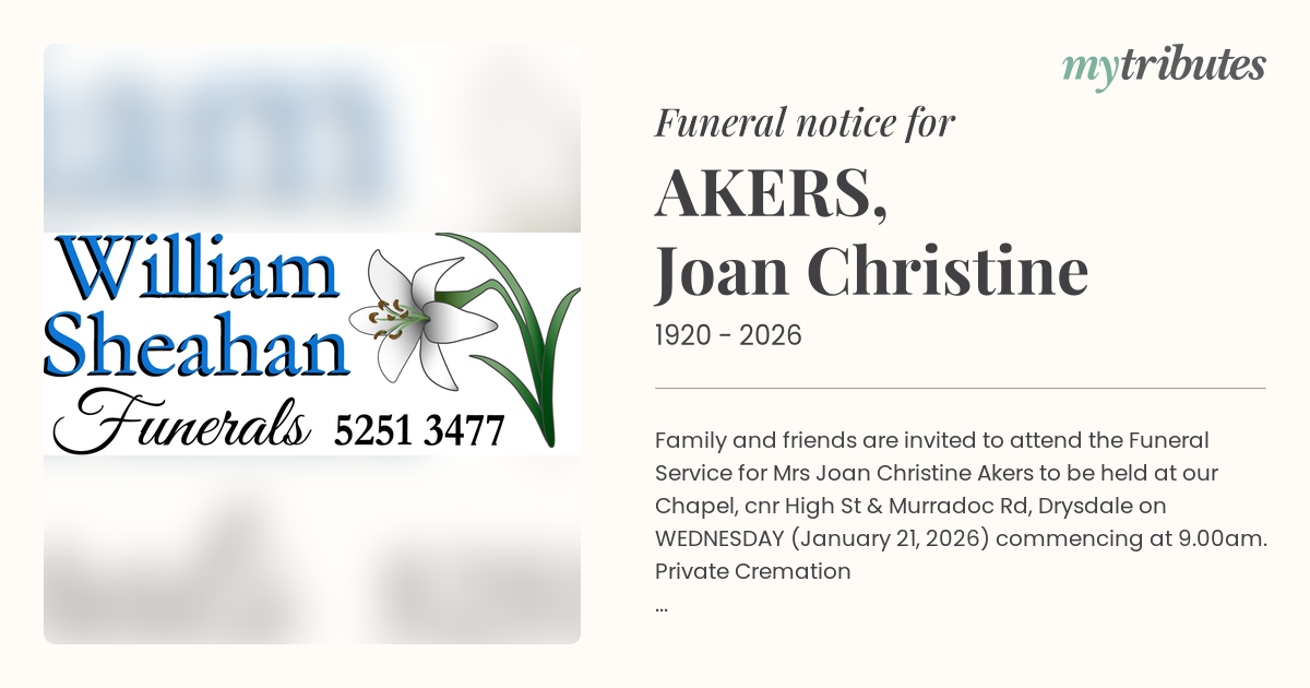 12°CFamily and friends are invited to attend the Funeral Service for Mrs Joan Christine Akers to be held at our Chapel, cnr High St & Murradoc Rd, Drysdale on WEDNESDAY (January 21, 2026) commencing at 9.00am.