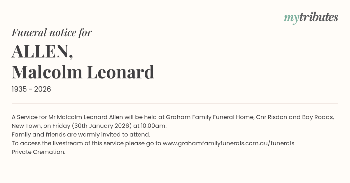 12°CA Service for Mr Malcolm Leonard Allen will be held at Graham Family Funeral Home, Cnr Risdon and Bay Roads, New Town, on Friday (30th January 2026) at 10.00am.