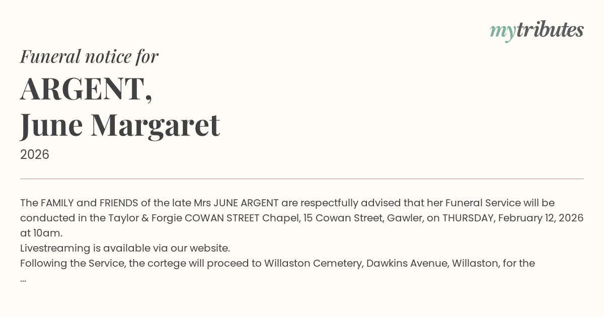 12°CThe FAMILY and FRIENDS of the late Mrs JUNE ARGENT are respectfully advised that her Funeral Service will be conducted in the Taylor & Forgie COWAN STREET Chapel, 15 Cowan Street, Gawler, on THURSDAY, February 12, 2026 at 10am.