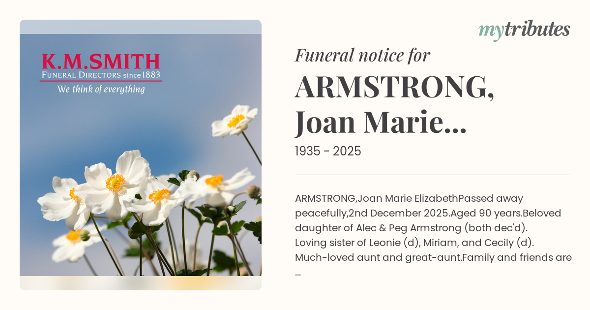 Beloved daughter of Alec & Peg Armstrong (both dec'd). Loving sister of Leonie (d), Miriam, and Cecily (d). Much-loved aunt and great-aunt.