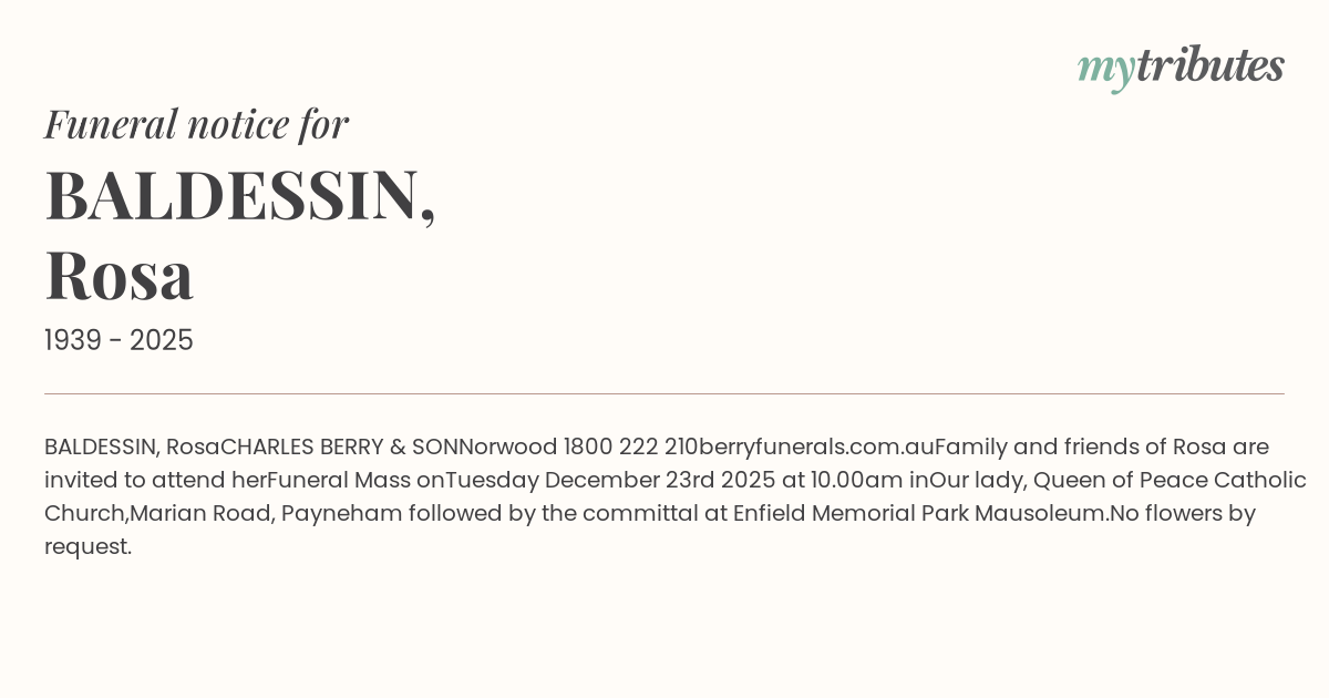 Marian Road, Payneham followed by the committal at Enfield Memorial Park Mausoleum.