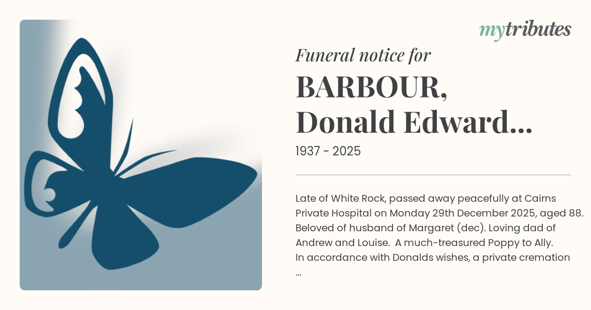 12°CLate of White Rock, passed away peacefully at Cairns Private Hospital on Monday 29th December 2025, aged 88.