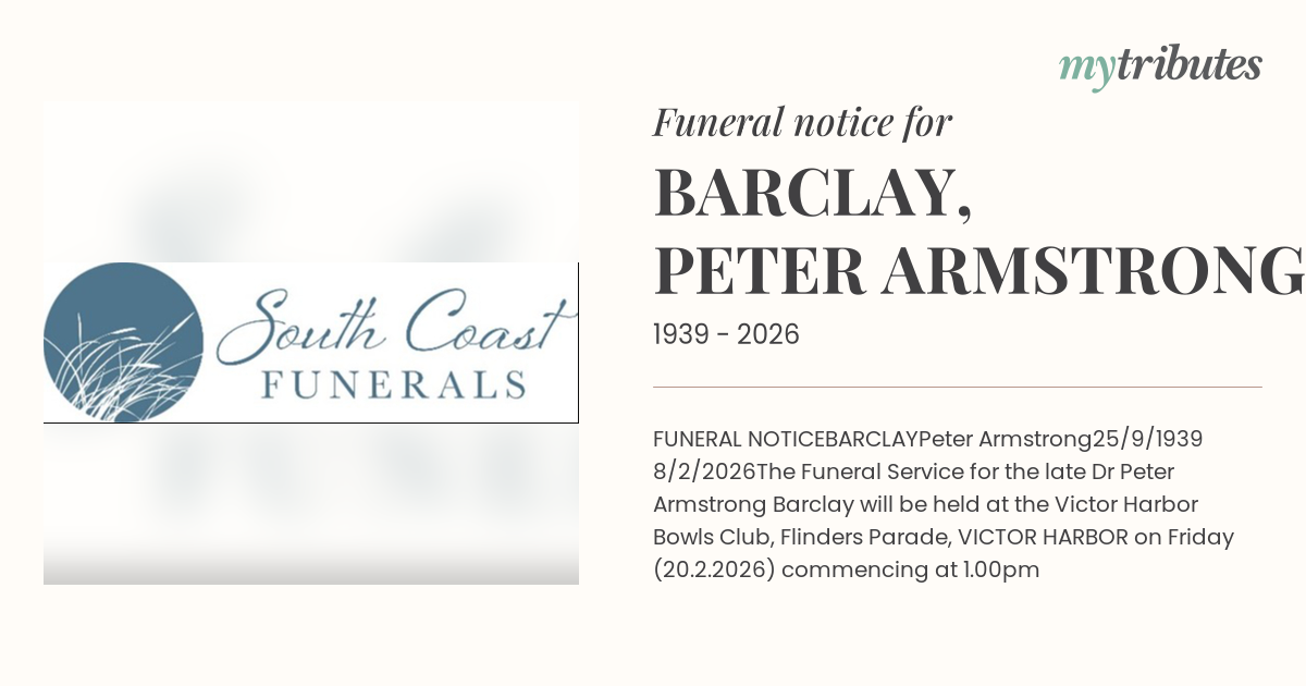 The Funeral Service for the late Dr Peter Armstrong Barclay will be held at the Victor Harbor Bowls Club, Flinders Parade, VICTOR HARBOR on Friday (20.2.2026) commencing at 1.00pm