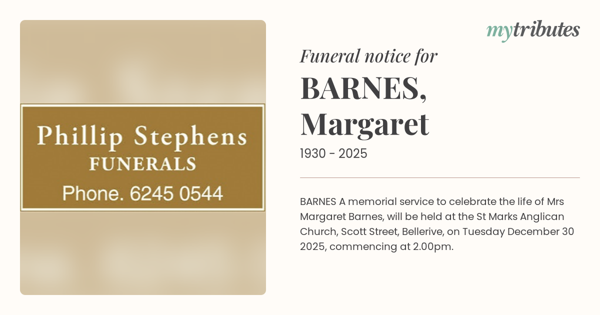 12°CBARNES A memorial service to celebrate the life of Mrs Margaret Barnes, will be held at the St Mark’s Anglican Church, Scott Street, Bellerive, on Tuesday December 30 2025, commencing at 2.00pm.