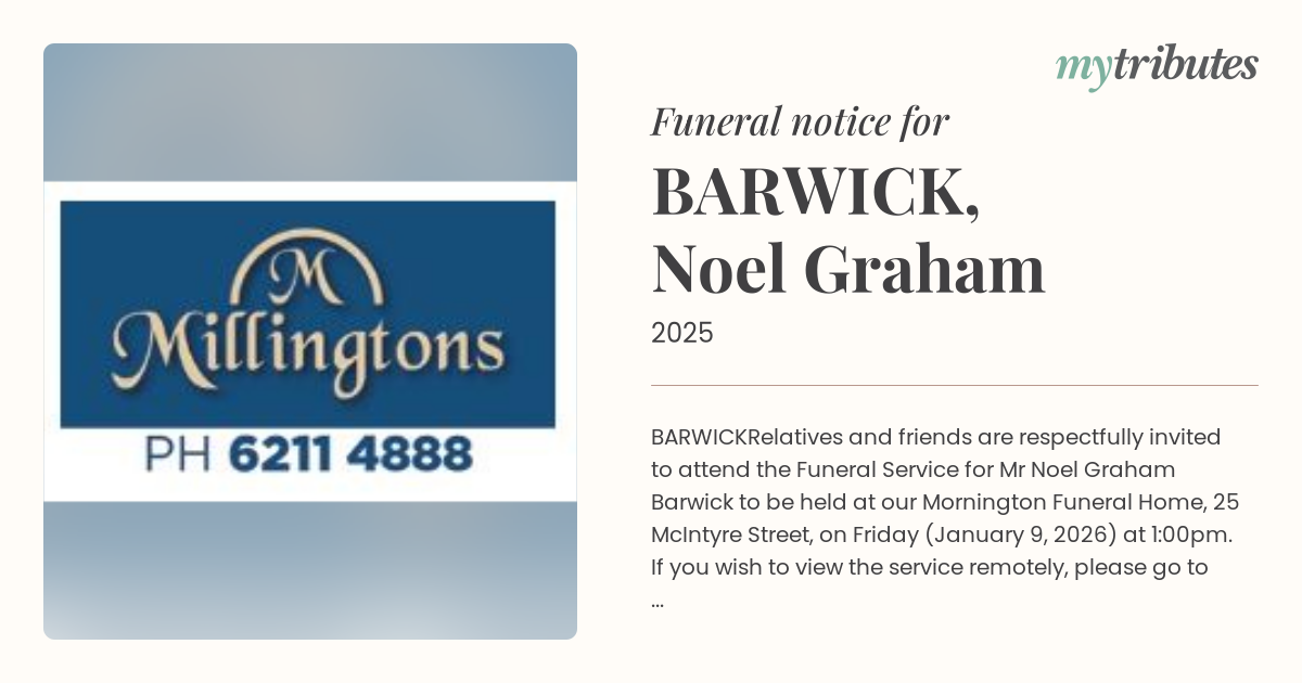 Relatives and friends are respectfully invited to attend the Funeral Service for Mr Noel Graham Barwick to be held at our Mornington Funeral Home, 25 McIntyre Street, on Friday (January 9, 2026) at 1:00pm. If you wish to