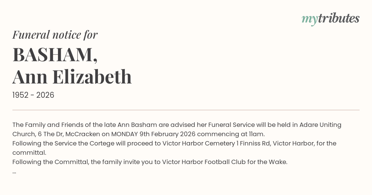 12°CThe Family and Friends of the late Ann Basham are advised her Funeral Service will be held in Adare Uniting Church, 6 The Dr, McCracken on MONDAY 9th February 2026 commencing at 11am.