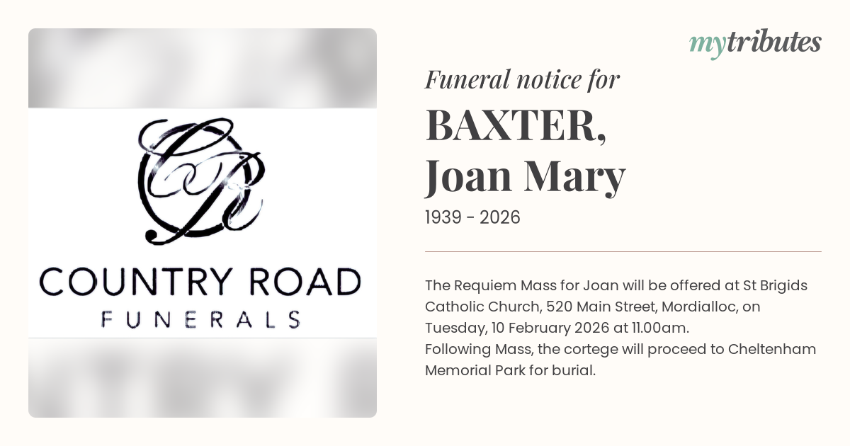 12°CThe Requiem Mass for Joan will be offered at St Brigid’s Catholic Church, 520 Main Street, Mordialloc, on Tuesday, 10 February 2026 at 11.00am.