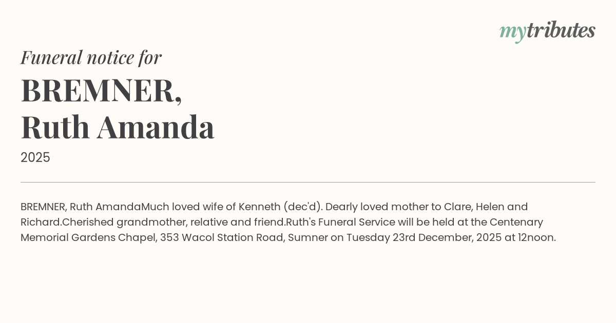 Ruth's Funeral Service will be held at the Centenary Memorial Gardens Chapel, 353 Wacol Station Road, Sumner on Tuesday 23rd December, 2025 at 12noon.