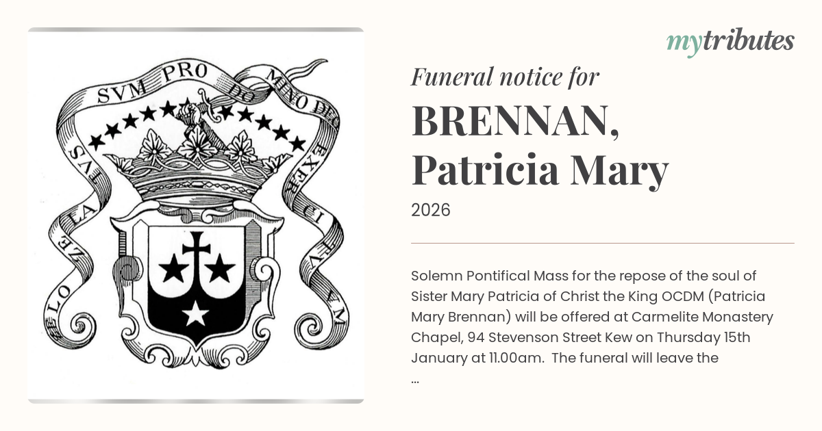 12°CSolemn Pontifical Mass for the repose of the soul of Sister Mary Patricia of Christ the King OCDM (Patricia Mary Brennan) will be offered at Carmelite Monastery Chapel, 94 Stevenson Street Kew on Thursday 15th January at 11.00am. The funeral will leave the Carmelite Monastery at the conclusion of refreshments for burial at Melbourne General Cemetery, College Crescent Parkville.