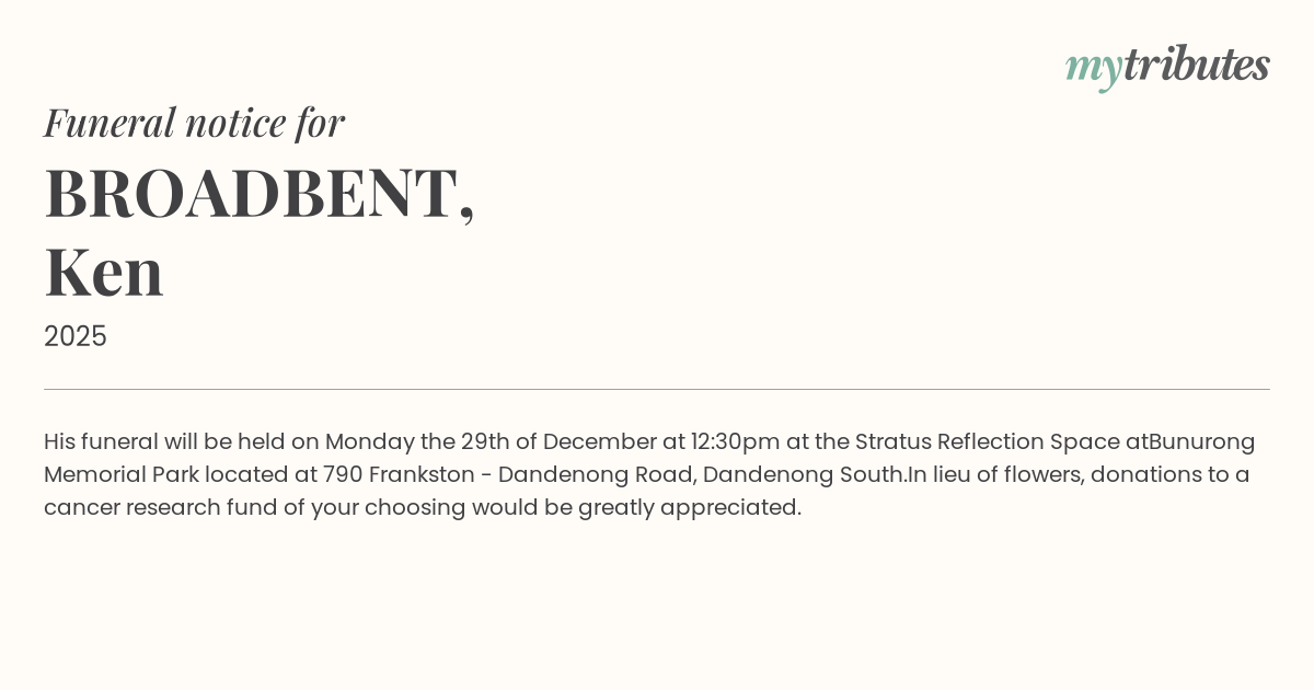 12°CHis funeral will be held on Monday the 29th of December at 12:30pm at the Stratus Reflection Space at