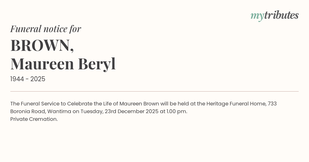 12°CThe Funeral Service to Celebrate the Life of Maureen Brown will be held at the Heritage Funeral Home, 733 Boronia Road, Wantirna on Tuesday, 23rd December 2025 at 1.00 pm.