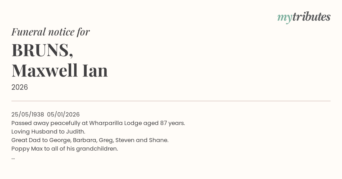 The Funeral of Maxwell Ian Bruns will be held at Echuca Cemetery, Warren Street Echuca on Friday 16th January commencing at 2:00pm.