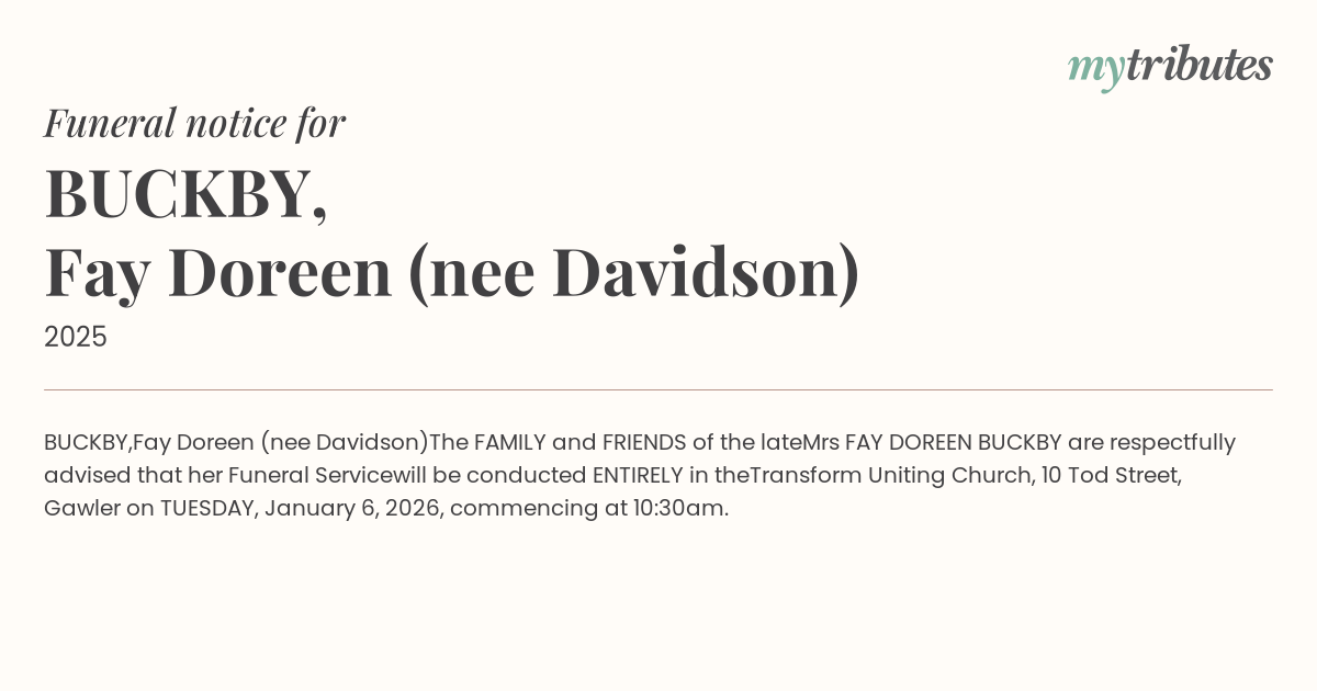 Mrs FAY DOREEN BUCKBY are respectfully advised that her Funeral Service