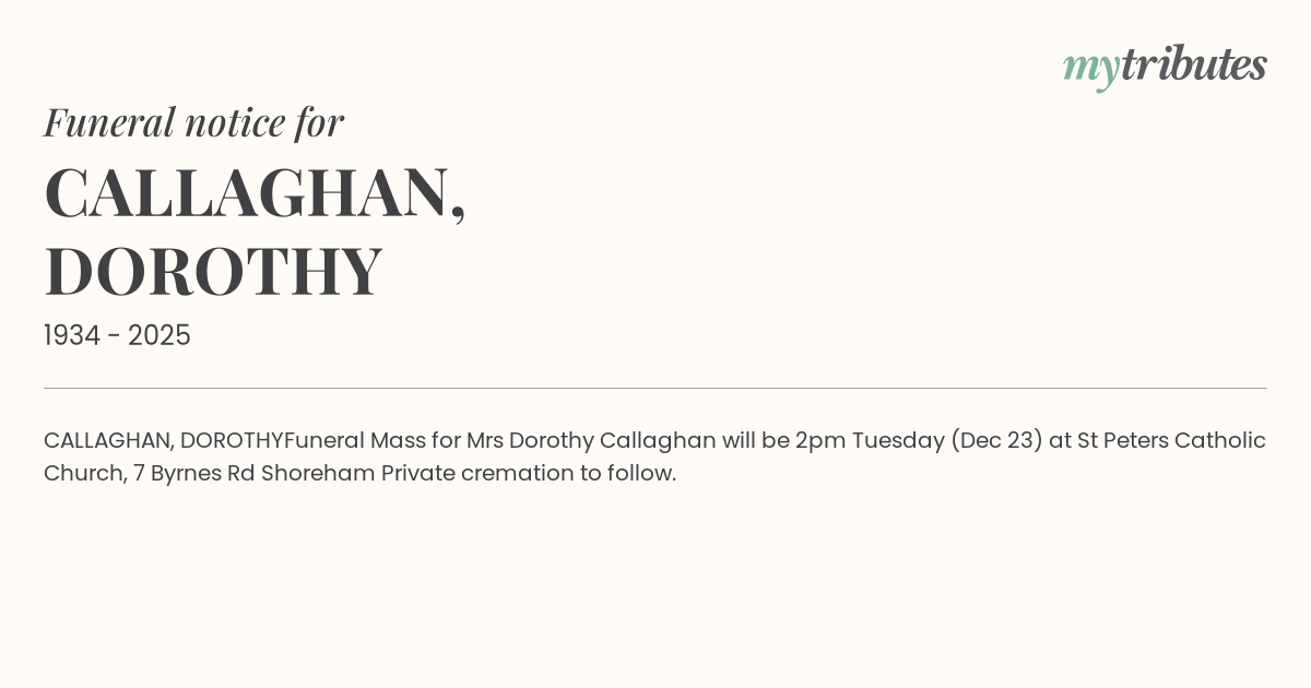Funeral Mass for Mrs Dorothy Callaghan will be 2pm Tuesday (Dec 23) at St Peters Catholic Church, 7 Byrnes Rd Shoreham Private cremation to follow.