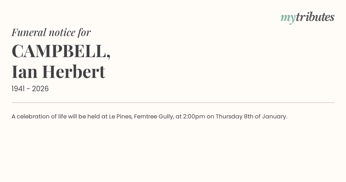 12°CA celebration of life will be held at Le Pines, Ferntree Gully, at 2:00pm on Thursday 8th of January.