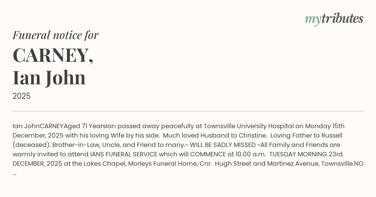 All Family and Friends are warmly invited to attend IAN’S FUNERAL SERVICE which will COMMENCE at 10.00 a.m. TUESDAY MORNING 23rd DECEMBER, 2025 at the Lakes Chapel, Morleys Funeral Home, Cnr. Hugh Street and Martinez Avenue, Townsville.
