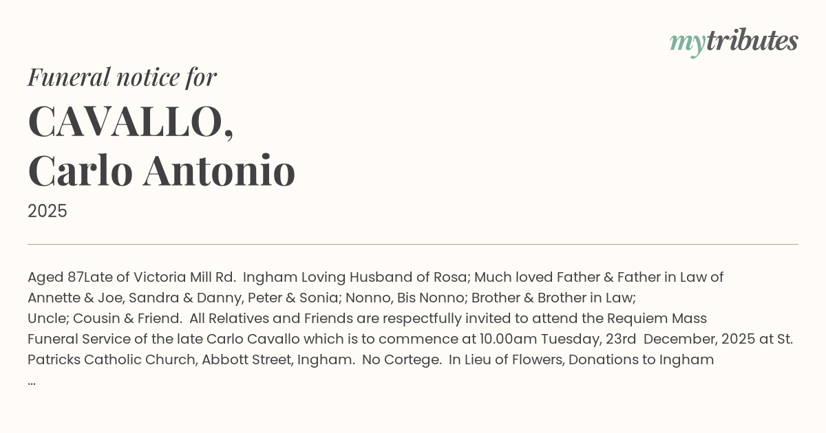 All Relatives and Friends are respectfully invited to attend the Requiem Mass Funeral Service of the late Carlo Cavallo which is to commence at 10.00am Tuesday, 23rd December, 2025 at St. Patrick’s Catholic Church, Abbott Street, Ingham.