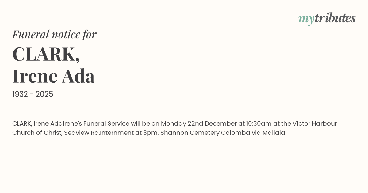 Irene's Funeral Service will be on Monday 22nd December at 10:30am at the Victor Harbour Church of Christ, Seaview Rd.