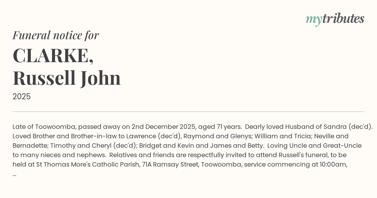 Relatives and friends are respectfully invited to attend Russell's funeral, to be held at St Thomas More's Catholic Parish, 71A Ramsay Street, Toowoomba, service commencing at 10:00am, Thursday, 18th December 2025, followed by interment at Drayton and Toowoomba Cemetery.