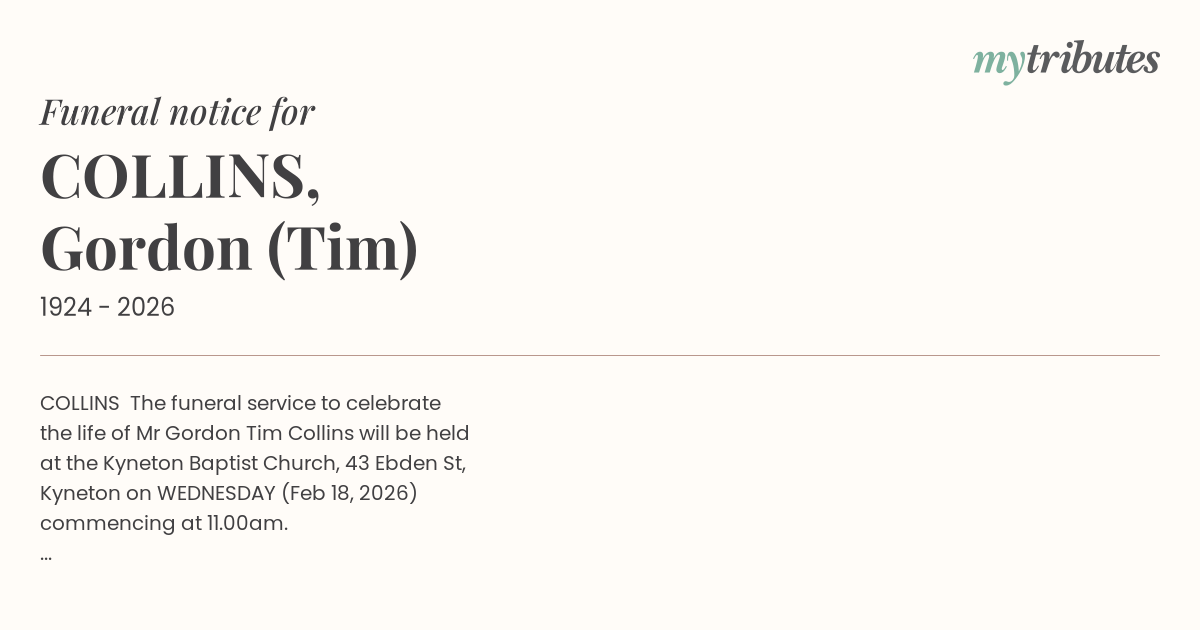 the life of Mr Gordon ‘Tim’ Collins will be held