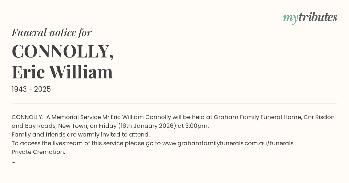 12°CCONNOLLY. A Memorial Service Mr Eric William Connolly will be held at Graham Family Funeral Home, Cnr Risdon and Bay Roads, New Town, on Friday (16th January 2026) at 3:00pm.