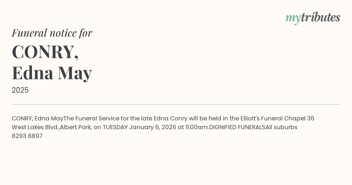 The Funeral Service for the late Edna Conry will be held
