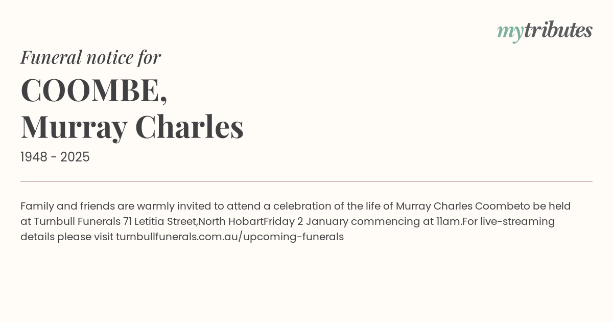 12°CFamily and friends are warmly invited to attend a celebration of the life of Murray Charles Coombe