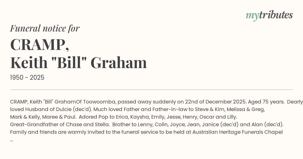 Family and friends are warmly invited to the funeral service to be held at Australian Heritage Funerals Chapel 314 James St Toowoomba, on 8th of January 2026 commencing at 11am.