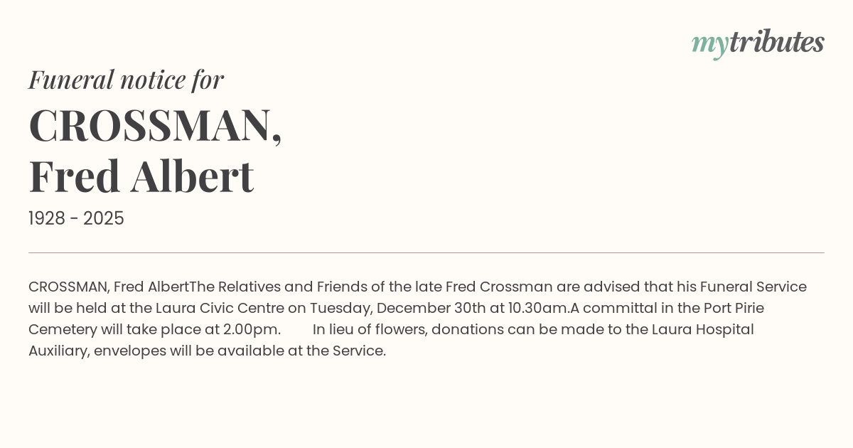 The Relatives and Friends of the late Fred Crossman are advised that his Funeral Service will be held at the Laura Civic Centre on Tuesday, December 30th at 10.30am.