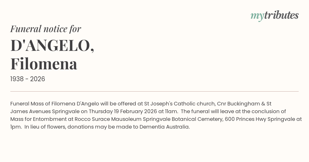 12°CFuneral Mass of Filomena D'Angelo will be offered at St Joseph's Catholic church, Cnr Buckingham & St James Avenues Springvale on Thursday 19 February 2026 at 11am. The funeral will leave at the conclusion of Mass for Entombment at Rocco Surace Mausoleum Springvale Botanical Cemetery, 600 Princes Hwy Springvale at 1pm. In lieu of flowers, donations may be made to Dementia Australia.
