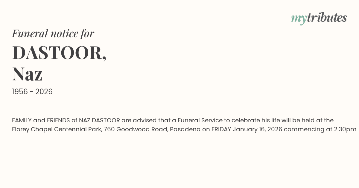 12°CFAMILY and FRIENDS of NAZ DASTOOR are advised that a Funeral Service to celebrate his life will be held at the Florey Chapel Centennial Park, 760 Goodwood Road, Pasadena on FRIDAY January 16, 2026 commencing at 2.30pm