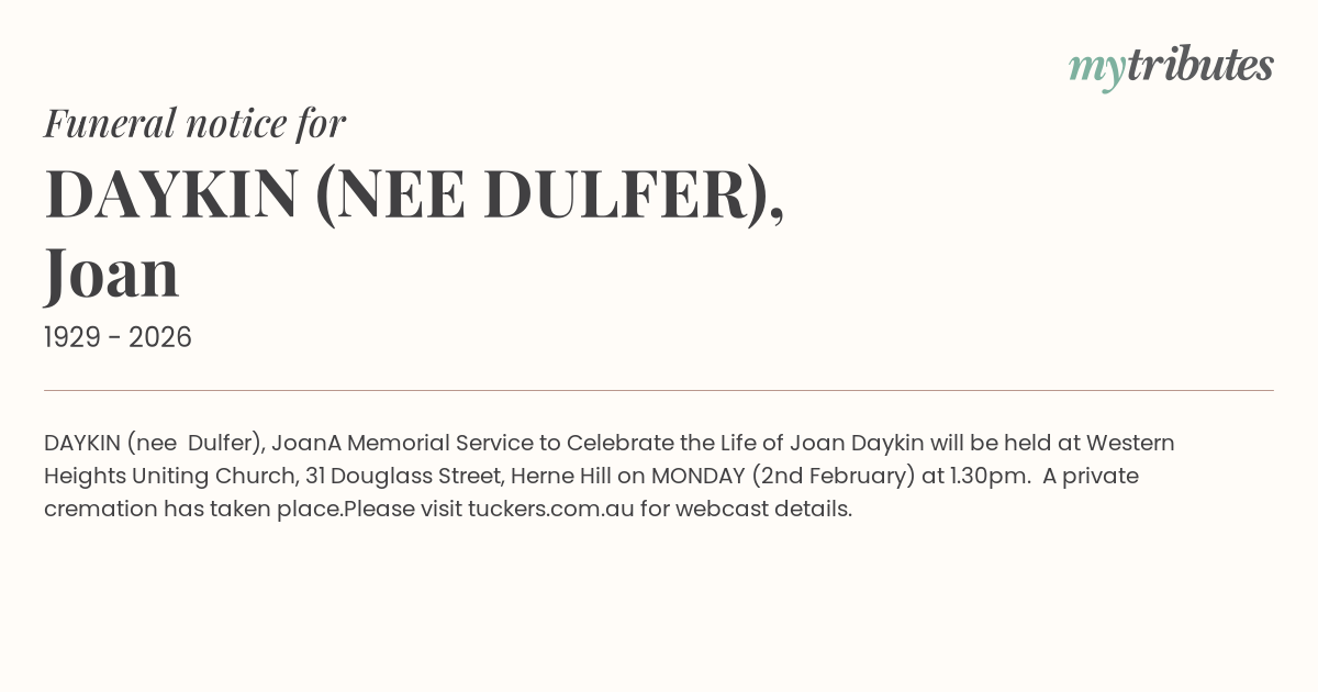 A Memorial Service to Celebrate the Life of Joan Daykin will be held at Western Heights Uniting Church, 31 Douglass Street, Herne Hill on MONDAY (2nd February) at 1.30pm. A private cremation has taken place.
