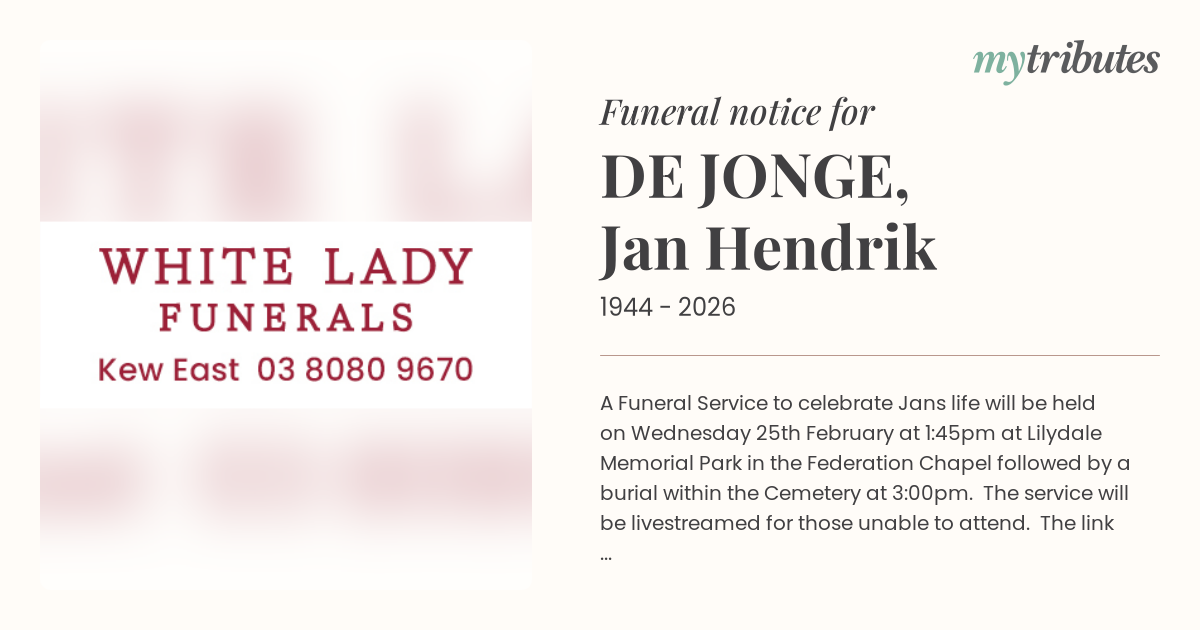 12°CA Funeral Service to celebrate Jan’s life will be held on Wednesday 25th February at 1:45pm at Lilydale Memorial Park in the Federation Chapel followed by a burial within the Cemetery at 3:00pm. The service will be livestreamed for those unable to attend. The link can be found on the White Lady Funerals website under 'Upcoming Funerals'