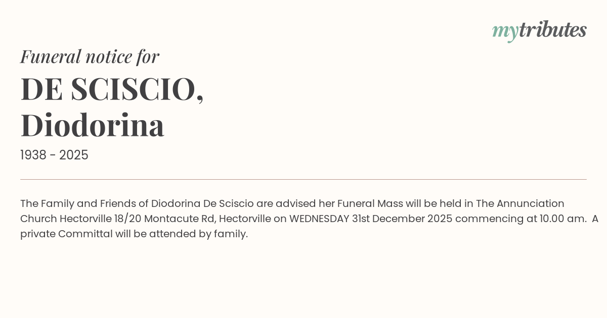 12°CThe Family and Friends of Diodorina De Sciscio are advised her Funeral Mass will be held in The Annunciation Church Hectorville 18/20 Montacute Rd, Hectorville on WEDNESDAY 31st December 2025 commencing at 10.00 am.