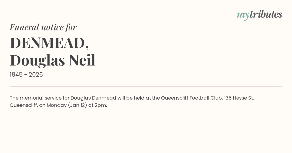 12°CThe memorial service for Douglas Denmead will be held at the Queenscliff Football Club, 136 Hesse St, Queenscliff, on Monday (Jan 12) at 2pm.
