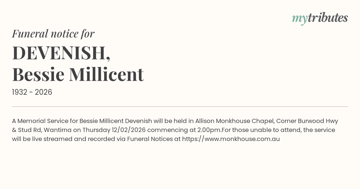 12°CA Memorial Service for Bessie Millicent Devenish will be held in Allison Monkhouse Chapel, Corner Burwood Hwy & Stud Rd, Wantirna on Thursday 12/02/2026 commencing at 2.00pm.