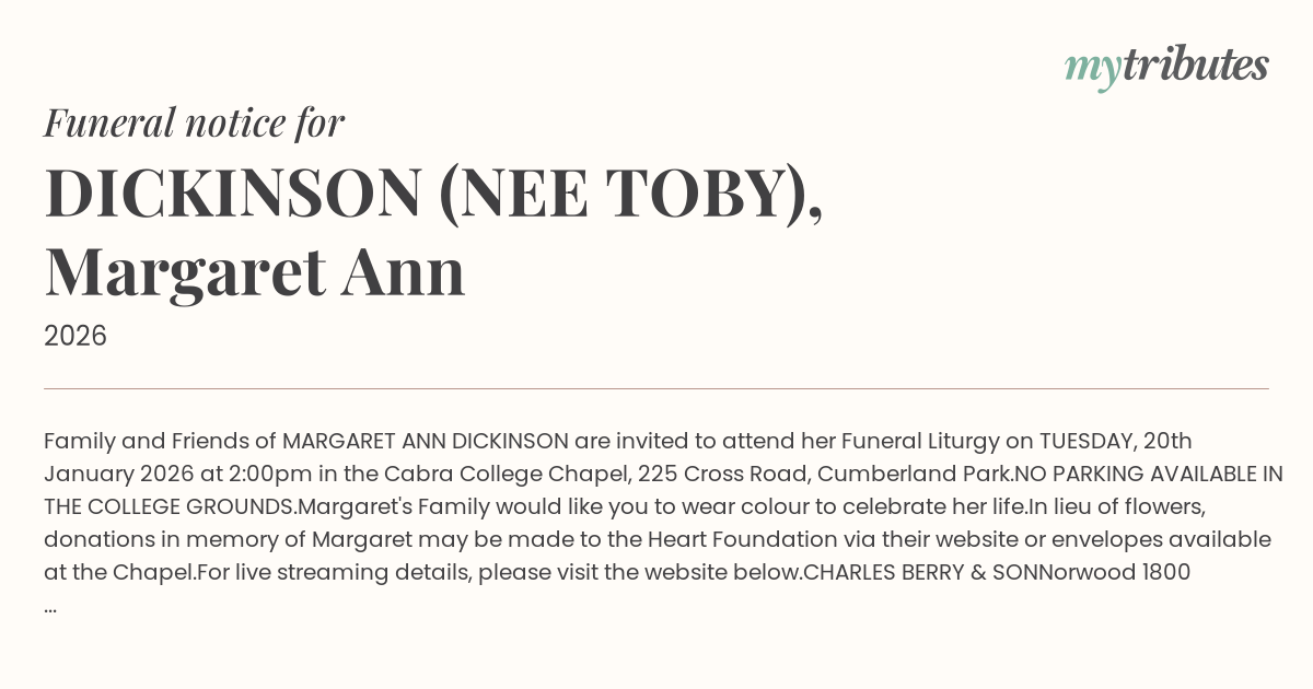12°CFamily and Friends of MARGARET ANN DICKINSON are invited to attend her Funeral Liturgy on TUESDAY, 20th January 2026 at 2:00pm in the Cabra College Chapel, 225 Cross Road, Cumberland Park.