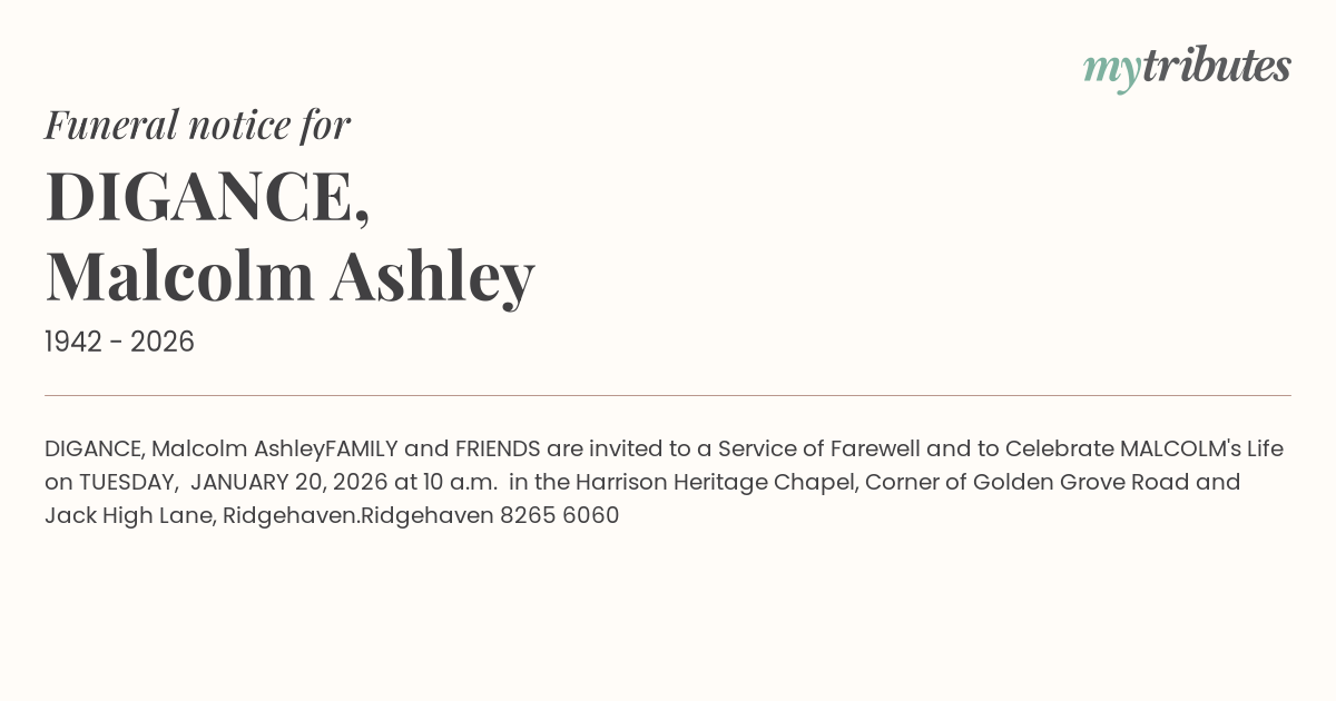 FAMILY and FRIENDS are invited to a Service of Farewell and to Celebrate MALCOLM's Life on TUESDAY, JANUARY 20, 2026 at 10 a.m. in the Harrison Heritage Chapel, Corner of Golden Grove Road and Jack High Lane, Ridgehaven.