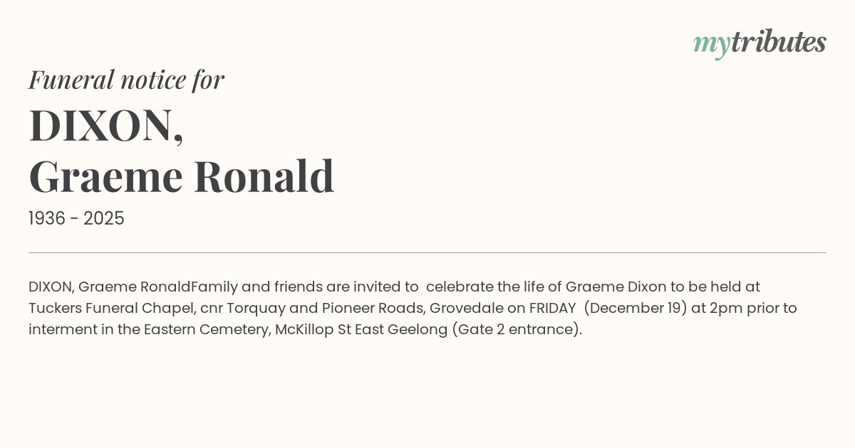 Family and friends are invited to celebrate the life of Graeme Dixon to be held at Tuckers Funeral Chapel, cnr Torquay and Pioneer Roads, Grovedale on FRIDAY (December 19) at 2pm prior to interment in the Eastern Cemetery, McKillop St East Geelong (Gate 2 entrance).