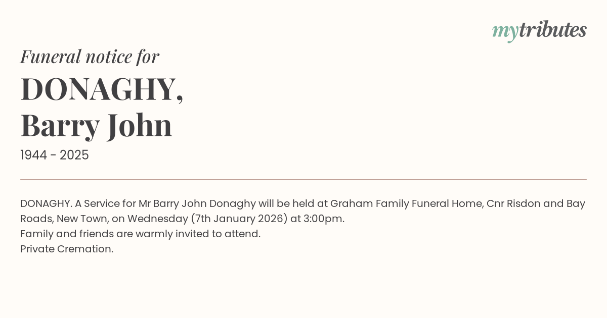 12°CDONAGHY. A Service for Mr Barry John Donaghy will be held at Graham Family Funeral Home, Cnr Risdon and Bay Roads, New Town, on Wednesday (7th January 2026) at 3:00pm.