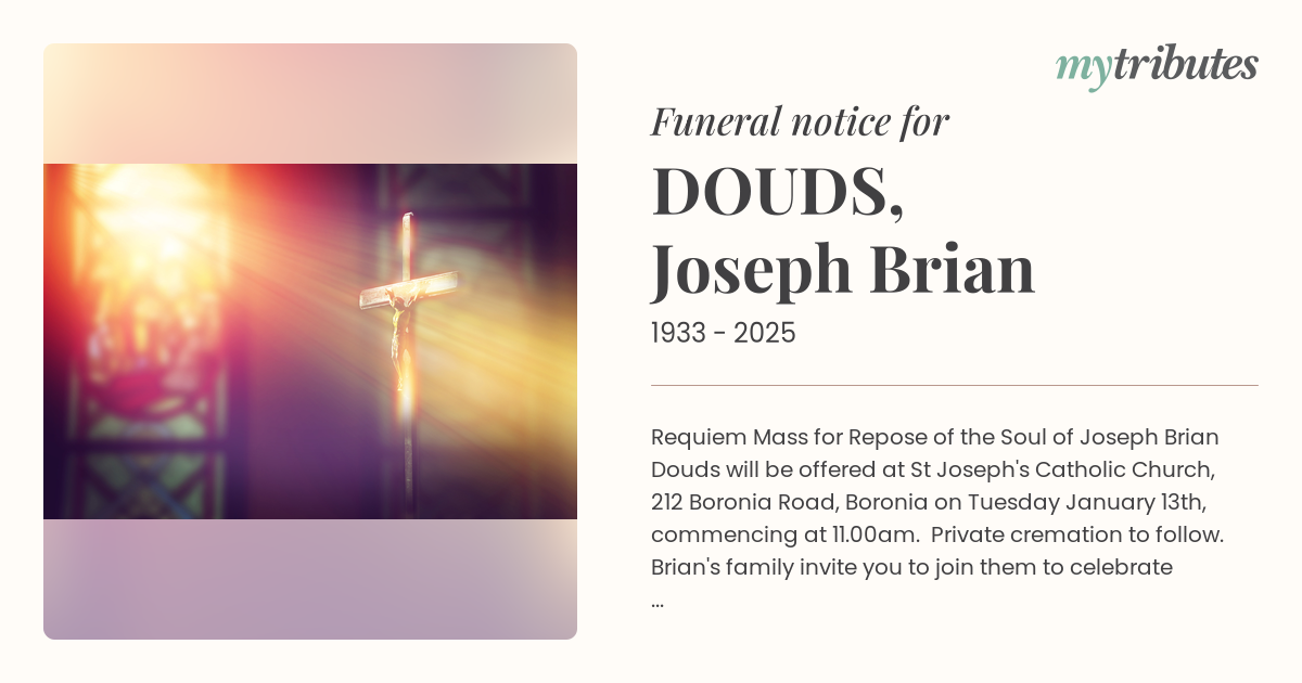 12°CRequiem Mass for Repose of the Soul of Joseph Brian Douds will be offered at St Joseph's Catholic Church, 212 Boronia Road, Boronia on Tuesday January 13th, commencing at 11.00am. Private cremation to follow. Brian's family invite you to join them to celebrate Brian's life after mass at the Knox Club, 480 Boronia Road, Wantirna South.