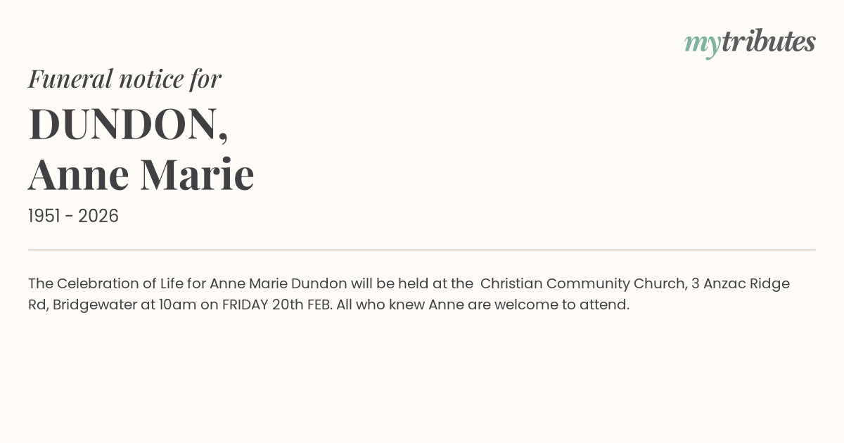 12°CThe Celebration of Life for Anne Marie Dundon will be held at the Christian Community Church, 3 Anzac Ridge Rd, Bridgewater at 10am on FRIDAY 20th FEB. All who knew Anne are welcome to attend.