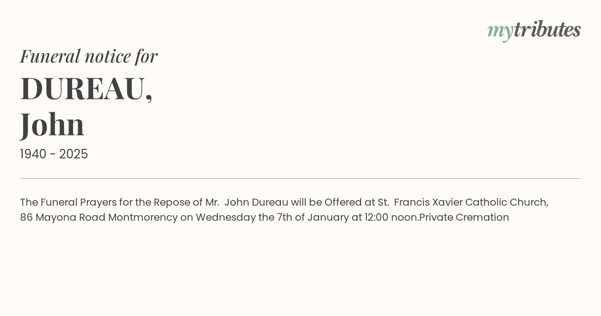 12°CThe Funeral Prayers for the Repose of Mr. John Dureau will be Offered at St. Francis Xavier Catholic Church, 86 Mayona Road Montmorency on Wednesday the 7th of January at 12:00 noon.
