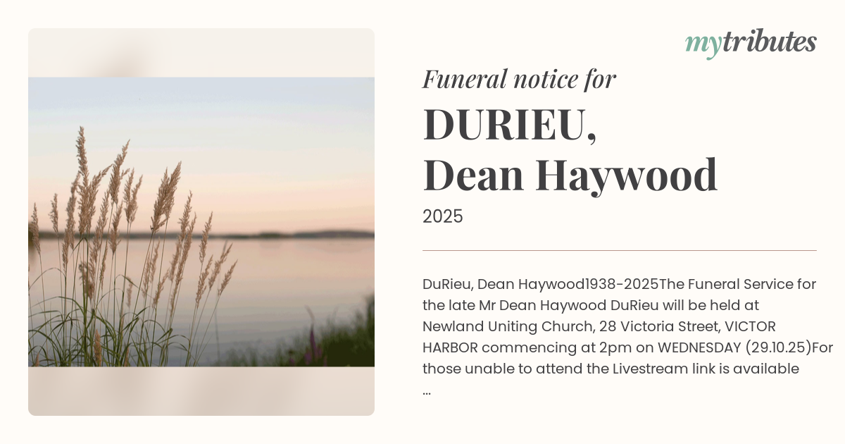 DuRieu will be held at Newland Uniting Church, 28 Victoria Street, VICTOR HARBOR commencing at 2pm on WEDNESDAY (29.10.25)