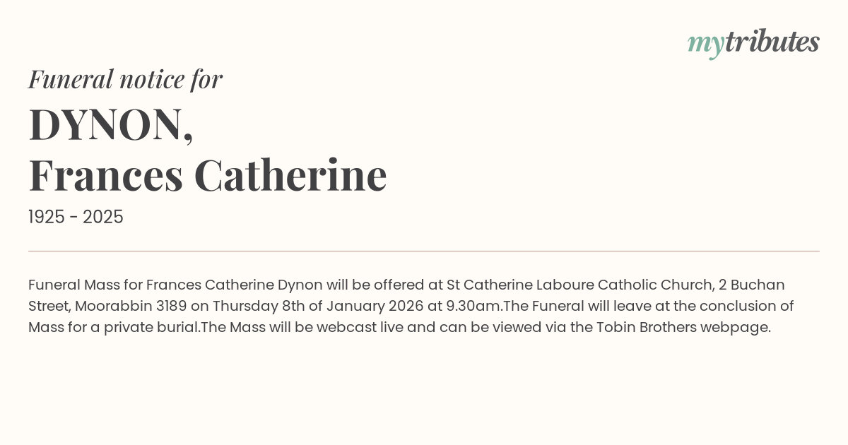 12°CFuneral Mass for Frances Catherine Dynon will be offered at St Catherine Laboure Catholic Church, 2 Buchan Street, Moorabbin 3189 on Thursday 8th of January 2026 at 9.30am.