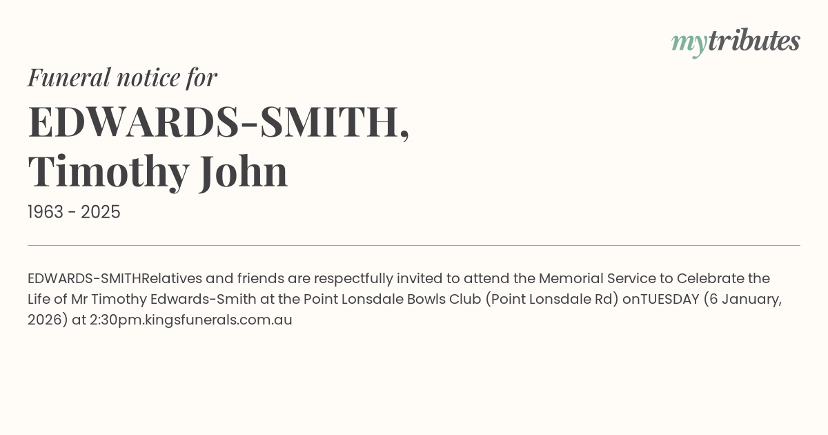 Relatives and friends are respectfully invited to attend the Memorial Service to Celebrate the Life of Mr Timothy Edwards-Smith