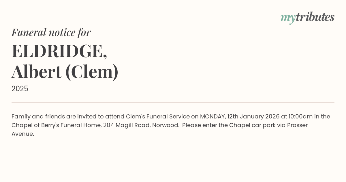 12°CFamily and friends are invited to attend Clem's Funeral Service on MONDAY, 12th January 2026 at 10:00am in the Chapel of Berry's Funeral Home, 204 Magill Road, Norwood.