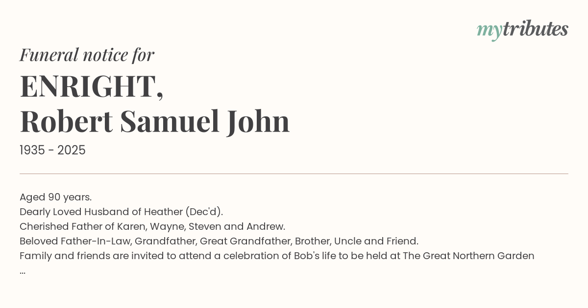 Family and friends are invited to attend a celebration of Bob's life to be held at The Great Northern Garden Of Remembrance on Tuesday 30th December, 2025. commencing at 11:00am.