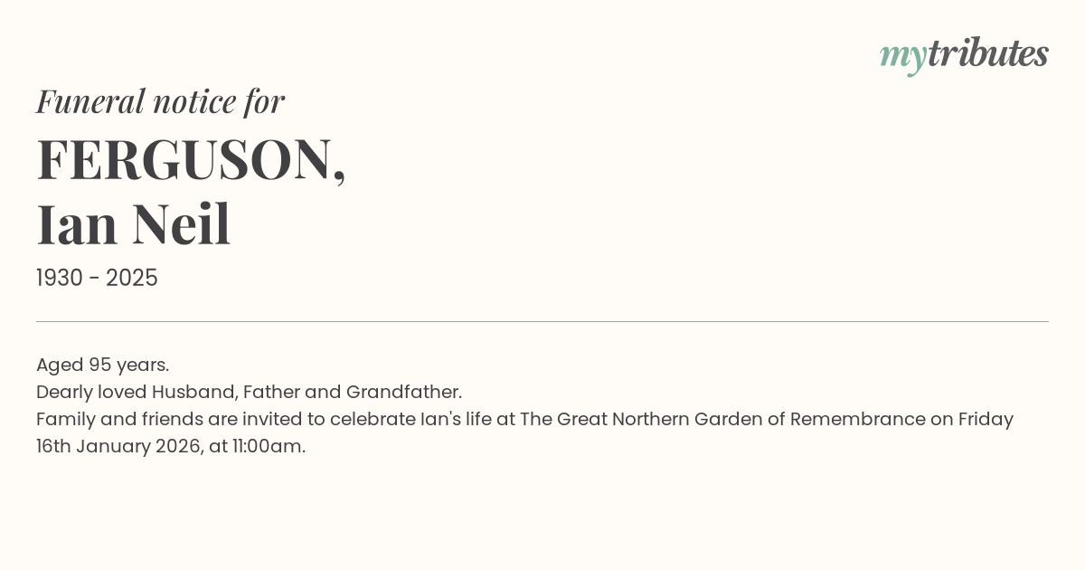 Family and friends are invited to celebrate Ian's life at The Great Northern Garden of Remembrance on Friday 16th January 2026, at 11:00am.