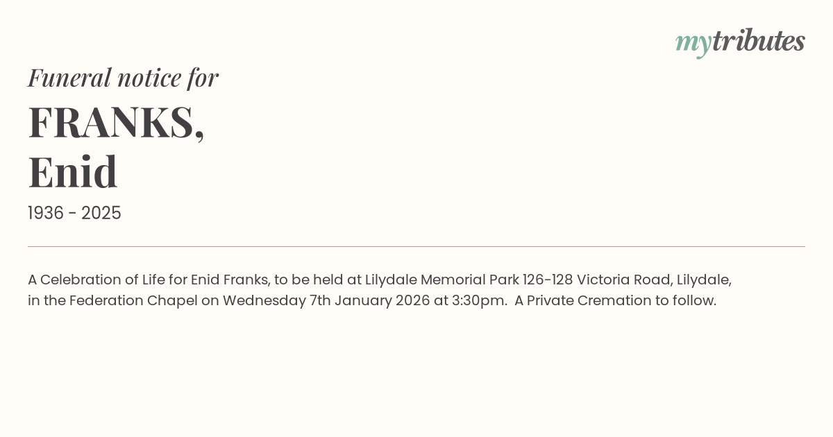 12°CA Celebration of Life for Enid Franks, to be held at Lilydale Memorial Park 126-128 Victoria Road, Lilydale, in the Federation Chapel on Wednesday 7th January 2026 at 3:30pm. A Private Cremation to follow.